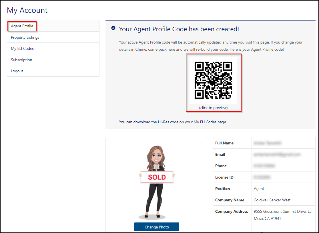 You can now download the ELi code assigned to this property and use it on yard-signs, MLS listing flyers or any other promotional material. Each of these Property Codes can be reused for another property after the listing sells. Simply go to “My ELi Codes” and change the Assigned Property, your ELi Code will remain the same so you don’t have to worry about re-printing your codes.