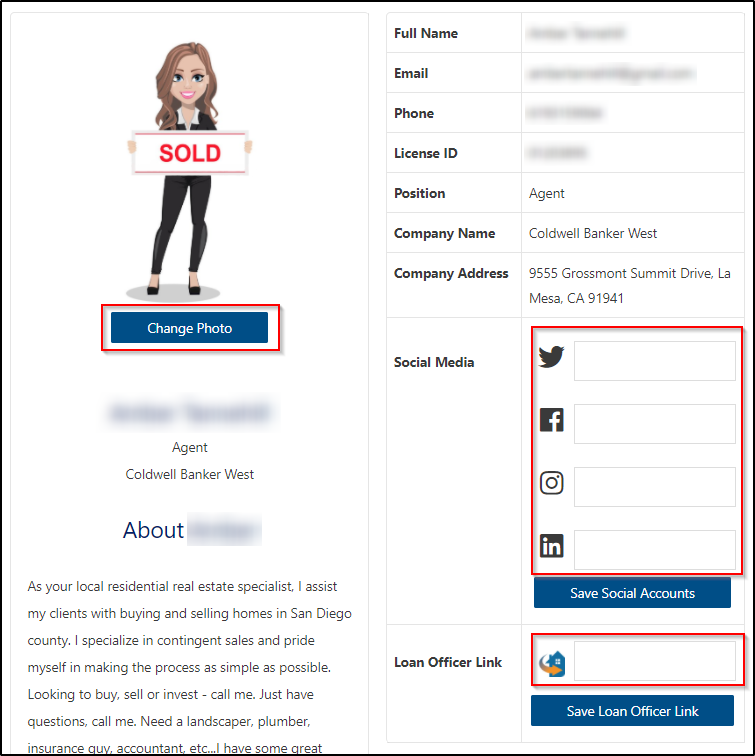 You have the freedom of adding a few more details to your Agent Profile Code, such as Social Media links and a Loan Officer link for Point Mortgage Corp. You can also change your Photo, if desired.